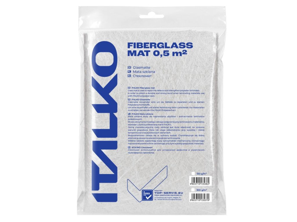 ITALKO jemná sklenená rohož s gramážou 150 g/m2 slúži v spojení s polyesterovými a epoxidovými živicami na výrobu a opravy predmetov z technického laminátu (lode, bazény, detské šmykľavky, autodiely atď.).